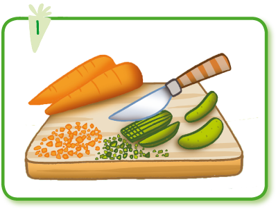 Taglia a pezzettini 3 carote e i cetrioli, poi prendi lo schiacciapatate e schiaccia le patate in una terrina